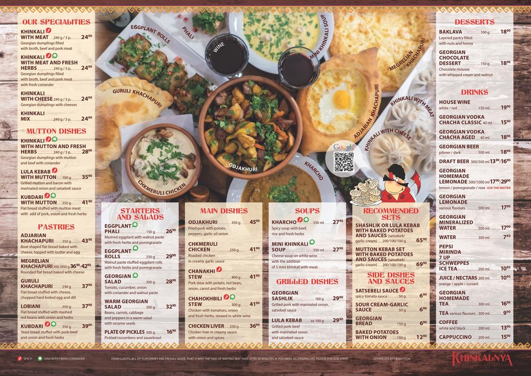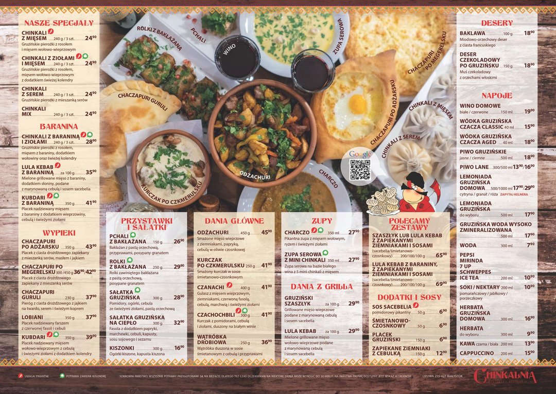 Chinkalnia Białystok to autentyczna restauracja gruzińska w sercu miasta, miejsce gdzie króluje prawdziwa kuchnia gruzińska. Specjalizujemy się w tradycyjnych daniach, a naszą dumą są ręcznie lepione pierogi chinkali oraz legendarne placki chaczapuri, w tym najsłynniejsze chaczapuri po Adżarsku z płynnym żółtkiem. W naszym menu znajdą Państwo również soczyste szaszłyki gruzińskie, aromatyczne dania mięsne, wegetariańskie oraz inne potrawy obiadowe oraz szeroki wybór oryginalnych pysznych win gruzińskich. Szukasz idealnego miejsca na niepowtarzalny smak, obiad, klimatyczną kolację lub spotkanie z przyjaciółmi? Odkryj gościnność i bogactwo smaków Kaukazu. Zapraszamy do najlepszej restauracji gruzińskiej w Centrum Białegostoku!